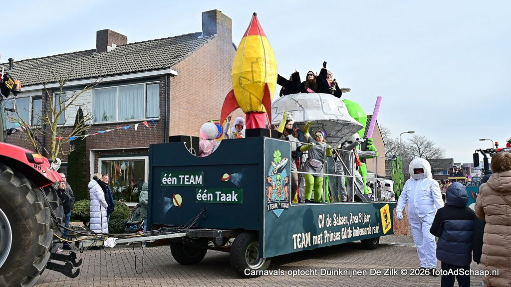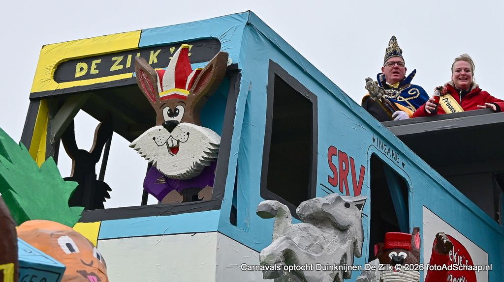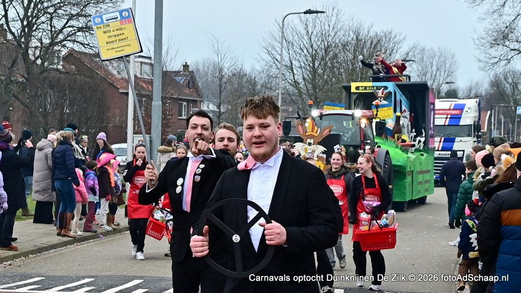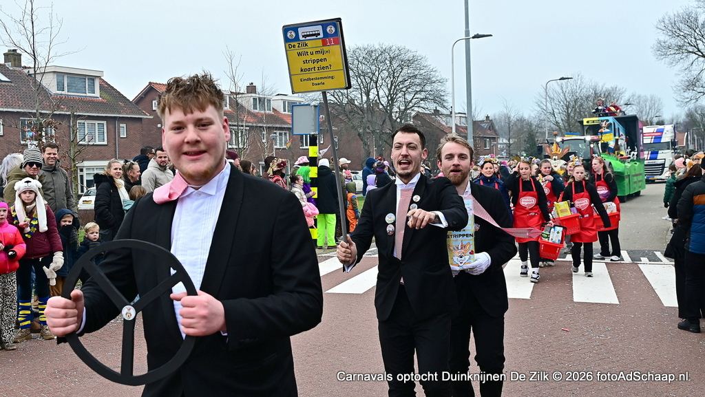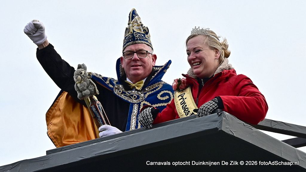 DE ZILK – Op zondagmiddag 15 februari begon stipt 13.11 uur de carnavalsoptocht in het Duinknijnenrijk van carnavalsvereniging de Duinknijnen in De Zilk. De start van de optocht begon op de Breeland en Sportlaan. Het winterweer was droog maar met een behoorlijk koude wind tegen het vriespunt aan. De carnavalswagens reden in een lange en kleurrijke stoet door het Duinknijnenrijk van Prins Sjoof en Prinses Diekie en van de Dwergknijnen Prins Sushi en Prinses Dushi. Tussen de wagens door liepen groepen deelnemers mee in fleurige kleding.