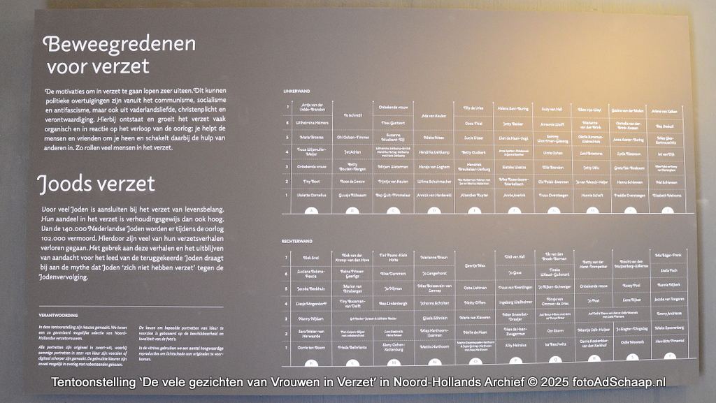 Het Noord-Hollands Archief (NHA) heeft ruim anderhalf jaar onderzoek gedaan naar vrouwen die tijdens de Tweede Wereldoorlog in verzet kwamen. In de samenleving is voornamelijk het gewapend verzet in herinnering gebleven, dat vooral werd uitgevoerd door mannen. Maar juist ook vrouwen speelden een cruciale rol. Ze waren belangrijke schakels in de infrastructuur van het verzet en werden, juist omdat ze vrouw waren, minder snel verdacht van verzetswerk. Hun werkzaamheden gingen van het redden van Joodse kinderen tot het zorgen voor onderduikers, van koerierswerk tot vervalsen, van illegale bladen maken en verspreiden tot spionage en van sabotage tot liquidaties. Na uitgebreid archiefonderzoek en contact met nabestaanden van verzetsvrouwen naar aanleiding van oproepen aan het publiek, is een lijst van bijna 1200 vrouwen gevormd, die in Noord-Holland in het verzet zaten. En deze lijst wordt nog steeds aangevuld.