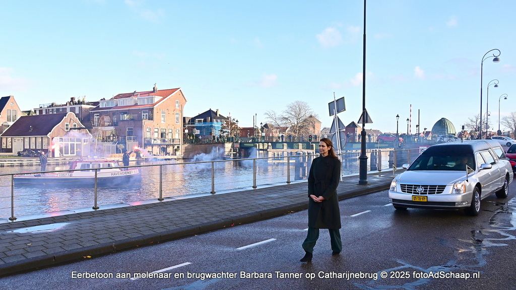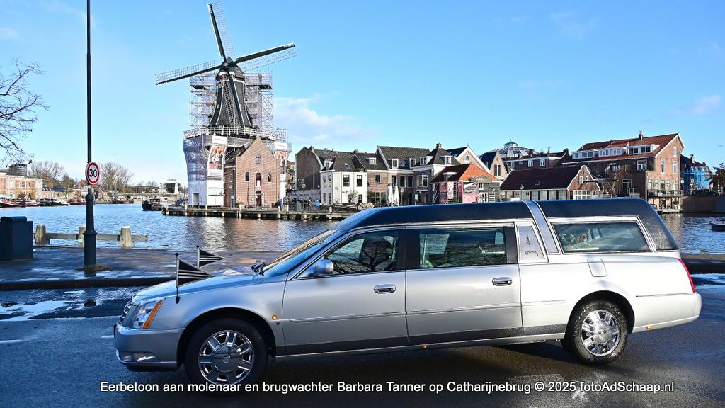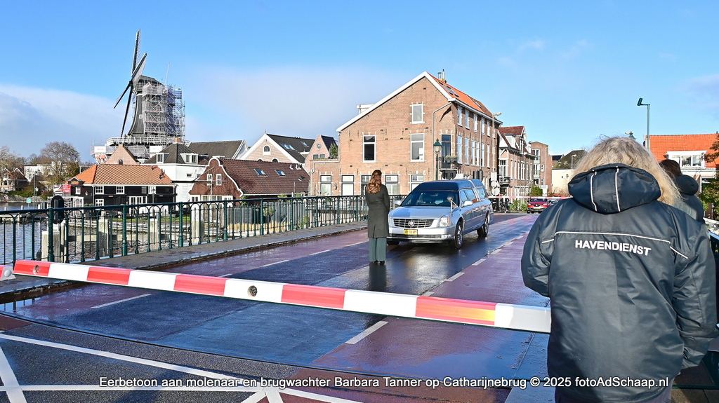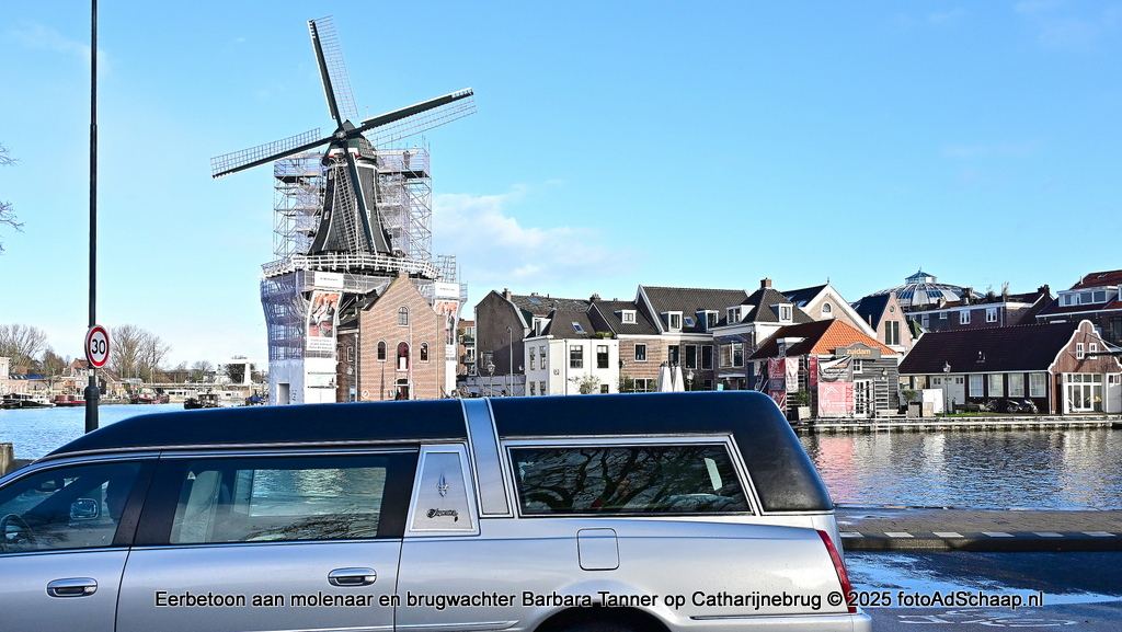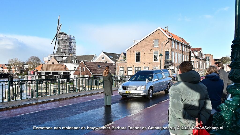 HAARLEM – Op maandag 17 november rond 14.30 uur werd de rouwstoet, met molenaar en brugwachter Barbara Tanner, opgesteld bij de Koepel aan de Papentorenvest. Daarna reed de rouwauto met de kist naar de Catharijnebrug, waar de rouwauto midden op de brug stil werd gezet. De brugwachters van Haarlem sloten de slagbomen van de brug één minuut als eerbetoon aan hun overleden collega Barbara Tanner.