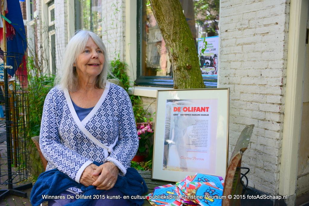 HAARLEM - Winnares De Olifant 2015 kunst- en cultuur publieksprijs Christine Peursum mocht het nog een dagje langer duren dan de voorgaande edities. Het mooie van de vijfhoek kunstroute is dat de meeste kunstenaars ...